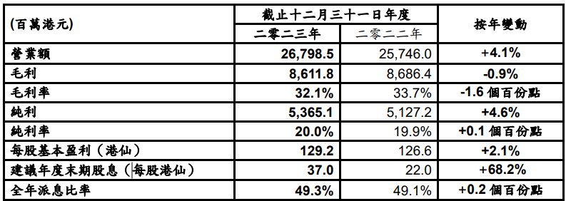 派息率保持穩(wěn)定 全年股息每股63.0港仙